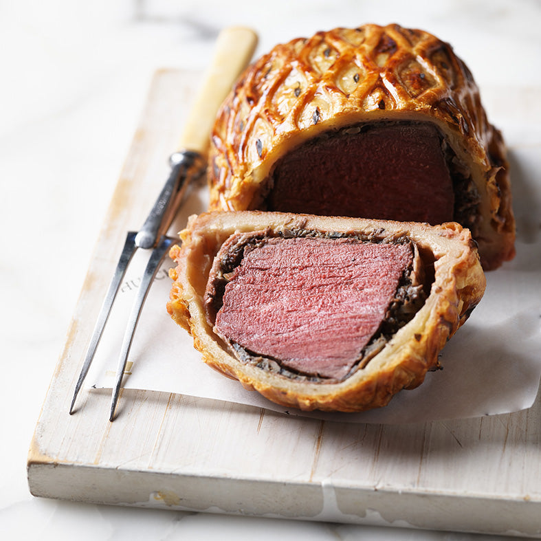 Each eye fillet is wrapped in a rich duxelles of mushrooms and herbs, layered with prosciutto, and encased in golden, buttery puff pastry.